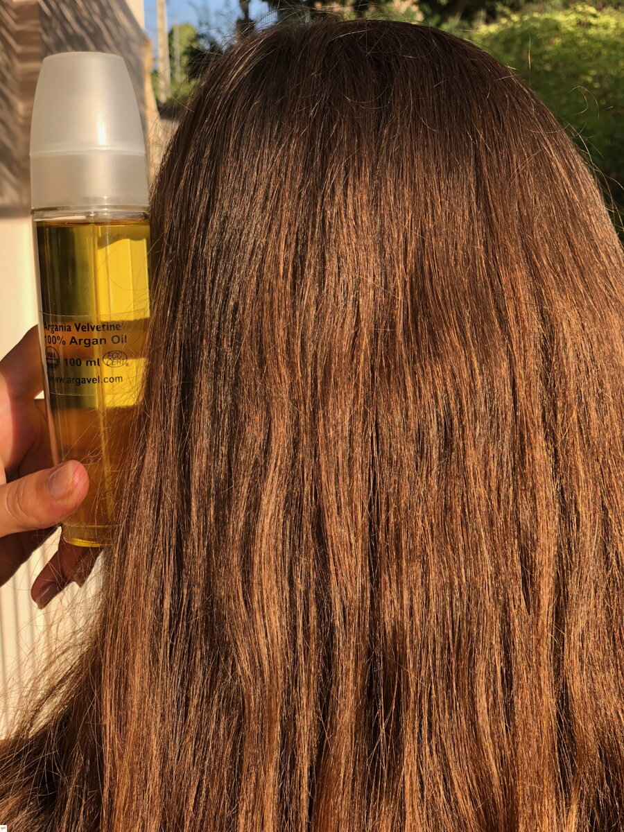 Do navlhčených vlasov úplne jednoducho vmasírujte malé množstvo oleja. V prípade, že chcete arganovým olejom dôkladne ošetriť celý objem vlasov, naneste potrebné množstvo oleja na vlasy, premasírujte ich a zabaľte do uteráka. Arganový zábal nechajte takto pôsobiť minimálne hodinu. Potom olej z vlasov umyte.