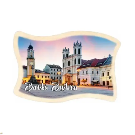 Drevená magnetka v tvare vlajky s motívom námestia SNP v Banskej Bystrici.